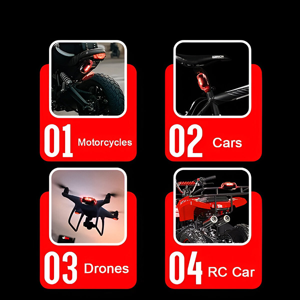 🚨 Widoczne z odległości 100+ metrów – 7 kolorów RGB i 3 tryby świecenia (szybki stroboskop, wolny stroboskop, stały) przełączane jednym naciśnięciem przycisku.
